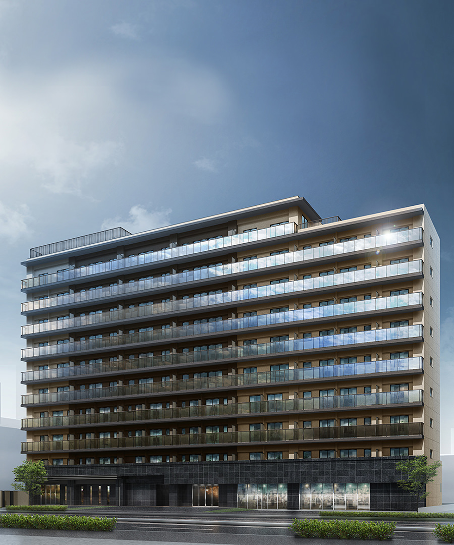 ※掲載の外観完成予想CGは、すべて計画段階の図面を基に描き起こしたもので実際とは異なる場合があります。なお、外観の細部及び設備機器等は一部省略又は簡略化しております。 植栽は計画段階のもので樹種・設定位置・植高・本数等は変更となる場合があります。竣工時には完成予想CG程度には成長しておりません。