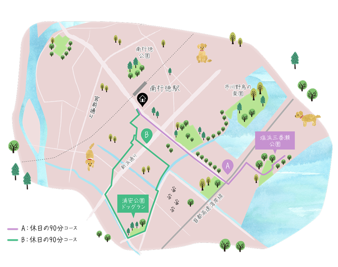 少し足を延ばせば「浦安公園ドッグラン」も利用可能。緑豊かな環境で、小型犬から大型犬まで安心して遊べます。休日のロング散歩の目的地や、いつもと違うコースを楽しみたい時におすすめです。